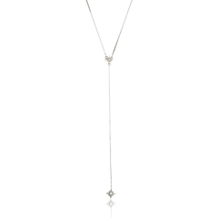Colar feito em prata 950 com banho de ouro ou banho de ródio, estilo gravatinha com dois pingentes em formato de estrelinha com uma cravação de zircônia branca de 2mm. O comprimento da corrente é de 50cm ao redor do pescoço + 10cm de gravatinha.